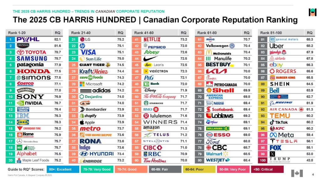 The Harris Poll Canada has just released its 2025 results, identifying the most visible businesses operating in Canada. This comprehensive study involved interviews with more than 8,000 Canadians over the course of the year. The poll focused on capturing the “main street view” of businesses, assessing their overall reputation among the Canadian public.