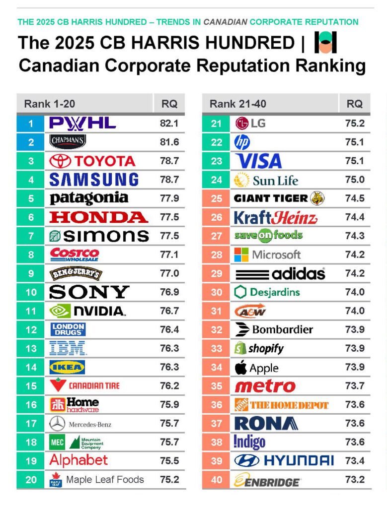 The Professional Women’s Hockey League (PWHL) and Chapman’s have both received the highest possible A+ ranking in the 2025 Harris Hundred Poll. This recognition highlights the exceptional reputation and visibility of these two Canadian brands within the country.